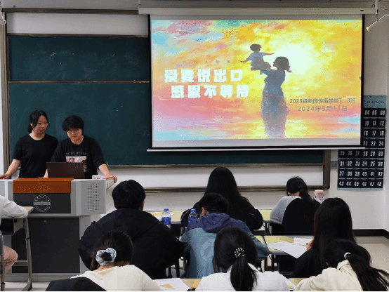 “同學(xué)們,猜一猜明天是什么節(jié)日啊?”“母親節(jié)!”5月11日,新聞傳播學(xué)類專業(yè)2023(7)、(8)班在K202教室開展以“愛要說出口,感恩不等待”為主題的團(tuán)建活動(dòng)。活動(dòng)開始前,活動(dòng)負(fù)責(zé)人、新聞傳播學(xué)類專業(yè)2023(7)、(8)班的班長(zhǎng)楊雨霏、朱研溪提前為每位同學(xué)準(zhǔn)備好信紙和信封。朱研溪說:“我們希望通過寫信這種傳統(tǒng)而深情的溝通方式,讓同學(xué)們勇敢表達(dá)自己的心聲,將對(duì)母親的愛訴說于筆尖。”學(xué)生們觀看一段關(guān)于母愛的感人短片后,...